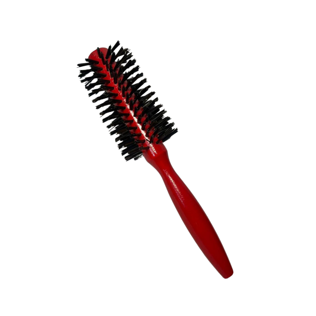 Cepillo de secado con cuerpo de madera y cerdas diseñadas para trabajar junto con el calor del secador, facilitando el alisado y el moldeado del cabello.