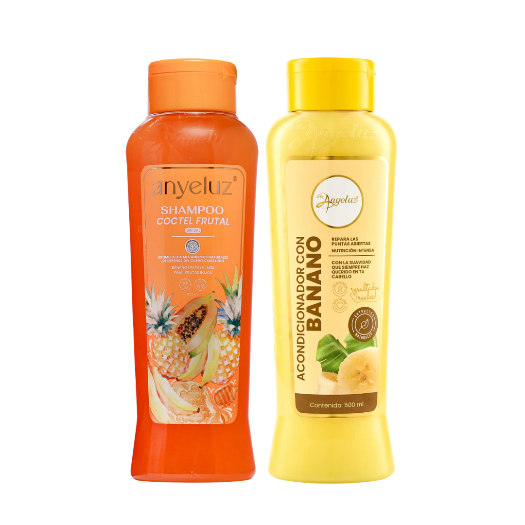 El balance perfecto para tu cabello: reparación e hidratación. El shampoo cóctel frutal ayuda a recuperar la salud capilar, mientras que el acondicionador con banano proporciona un extra de nutrición para un cabello más suave y manejable.