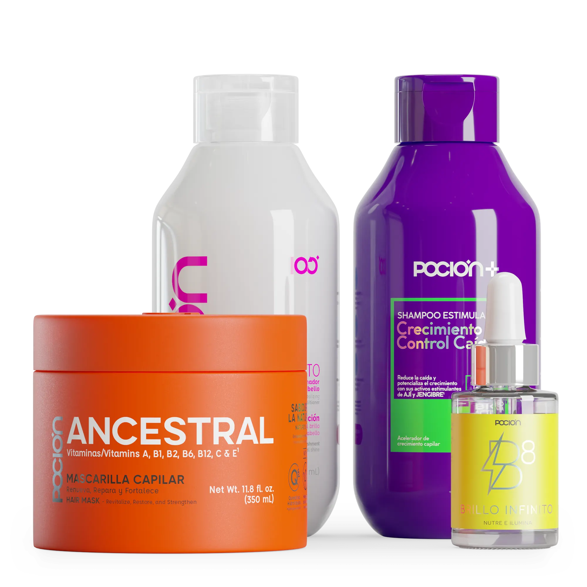 Contiene 4 productos: Shampoo Crecimiento y control caida,Tratamiento Acondicionador Reparación, Mascarilla Ancestral y Óleo Multifuncional B8.
